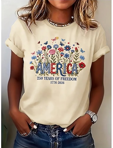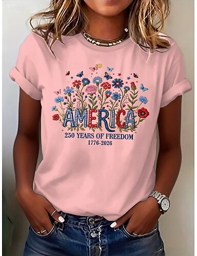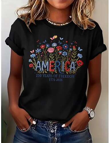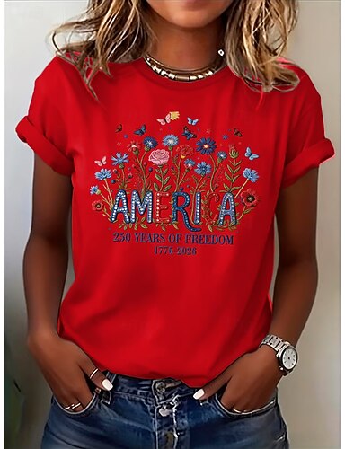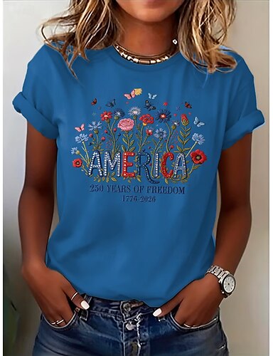 Giorno dell'Indipendenza Americana Per donna Maglietta Stampato Floreale Grafico Bandiera Elegante Classico Casual Manica Corta Girocollo Top Regolari Casuale Quotidiano Blu Nero Bianco Rosa Rosso