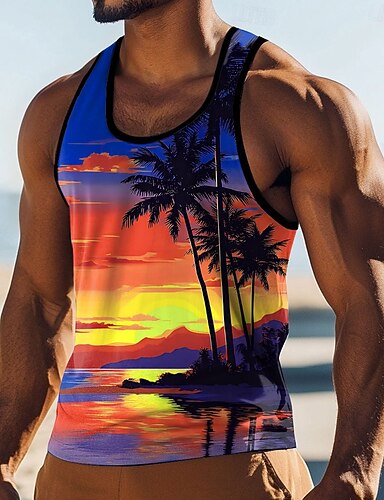 Canotta da uomo con palme tropicali, spiaggia, tramonto, paesaggio colorato, stile hawaiiano, canotta senza maniche, scollo a U, estate, spiaggia, vacanza, moda, casual, sportivo, maglietta,