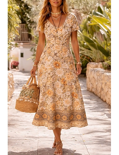 Per donna Abito Midi Abito Boho Abito Vintage Vestito Casual Abito Floreale Elegante Moda Moderno All'aperto Vacanza Uscire Vestibilità regolare Floreale Manica Corta Scollo a V Blu Giallo Rosso