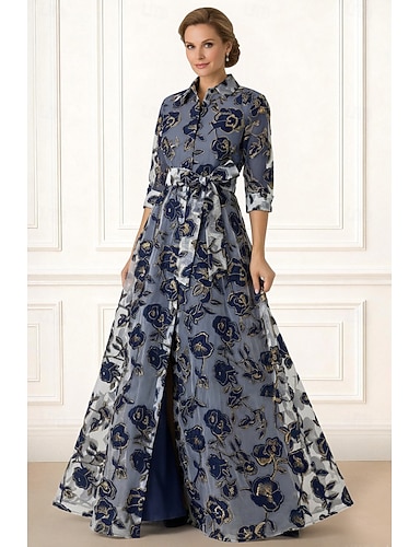 Linea ad A Lunghezza al pavimento Abito Camicia Abito da invitata a nozze Abito Formale Abito da cerimonia per signora Manica 3/4 Colletto a Camicia Elegante Semplice Formale Organza Jacquard con