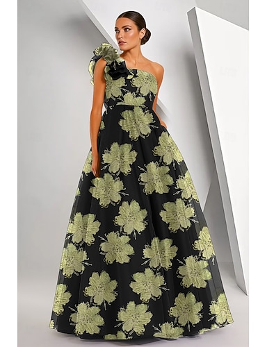 Linea ad A Lunghezza al pavimento Abito da Sera Da principessa Abito formale Elegante Manica Corta Monospalla Matrimonio Formale Tasca Pizzo Velluto con Stampa floreale