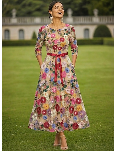 Linea ad A Lunghezza alla caviglia Vestito da Festa Abito da Cocktail Abito da invitata a nozze Abito da cerimonia per signora Manica 3/4 Collo gioiello Elegante Floreale Madre Formale Derby del