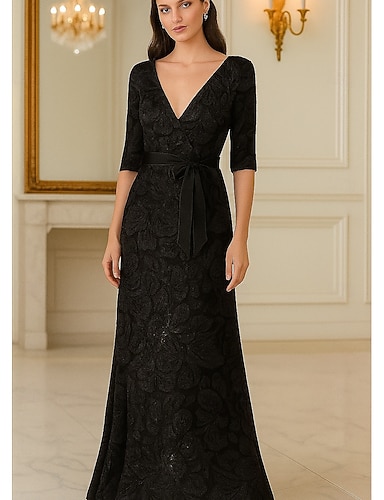 Linea ad A Lunghezza al pavimento Abito da invitata a nozze Abito da cerimonia per signora Mezza Manica Scollo a V Elegante Semplice Abbellito Formale Pizzo con Arricciato Perline