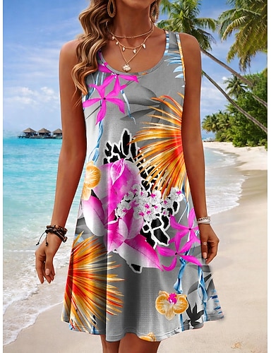 Per donna Mini Abito Vestito Estivo Abito a trapezio Abito Estivo Vacanza Casual Boho Spiaggia Feste Matrimonio Vestibilità regolare Grafico Tropicale Senza Maniche Collo a U Blu Viola Verde Grigio