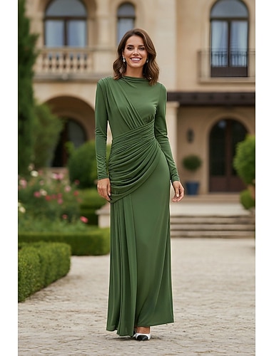 Tubino Colonna Lunghezza al pavimento Abiti per invitati a matrimoni Elegante Manica Lunga Collo Alto Festa in giardino Matrimonio con Pieghe Arricciato