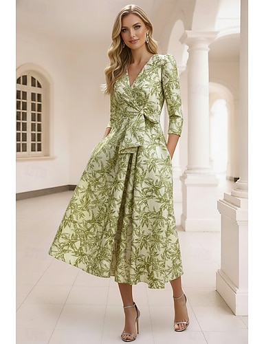 Abito da festa in linea A lunghezza tè abito da cocktail abito da invitata al matrimonio abito per la madre della sposa manica 3/4 collo a V elegante formale per invitati a matrimoni con drappeggio