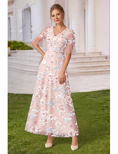 Linea ad A Abito Lunghezza alla caviglia Abito da Cocktail Abito da invitata a nozze Abito da cerimonia per signora Manica Corta Scollo a V Scollo a Barca Elegante Casual Formale con Ricamo