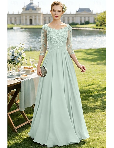 Linea ad A Lunghezza al pavimento Abito da invitata a nozze Abito Formale Abito da sera Abito da cerimonia per signora Manica 3/4 Scollo a V Elegante Ospite di nozze Ricevimento di matrimonio Chiffon