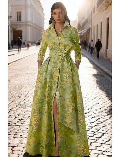 Linea ad A Lunghezza al pavimento Abito da Sera Elegante Spacco Alto Manica Lunga Colletto a Camicia Festa in giardino Matrimonio Tasca Jacquard con Stampa floreale Fiocco/Fiocchi Spacco