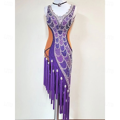 elegante abito da ballo latino da donna, gonna con frange di strass di cristallo viola, body in rete color carne, costume da competizione per samba, rumba e cha cha
