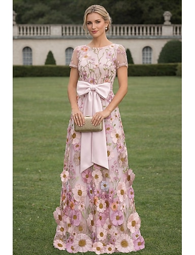 Linea ad A Lunghezza al pavimento Abito da cerimonia per signora Manica Corta Girocollo Elegante Vintage Lussuoso Formale Ospite di nozze Ricevimento di matrimonio Chiffon Pizzo Tulle con Stampa