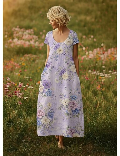 Per donna Abito lungo maxi Abito Boho Vestito Casual Vintage Quotidiano All'aperto Spiaggia Vestibilità regolare Floreale Manica Corta Collo a U Viola Estate Primavera