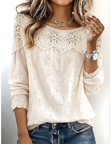 Per donna Camicia Blusa Pizzo Semplice Casual Manica Lunga Girocollo Top Regolari Quotidiano Uscire Bianco Estate