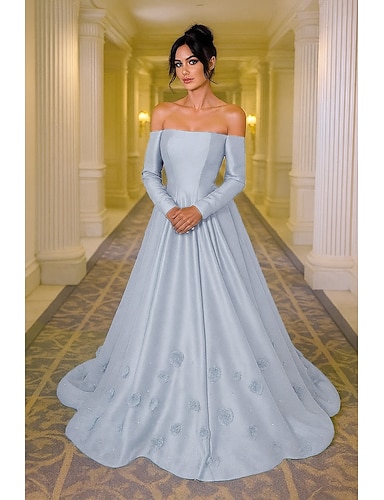 Linea ad A Strascico a Terra Abito da Sera Elegante Setoso Manica Lunga Senza Spalle Matrimonio Formale Tasca Raso con Cristalli