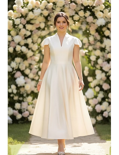 Linea ad A Lunghezza Tè Vestito da Festa Abito da Cocktail Abiti da sposa Abito da sposa Elegante Piccoli Abiti Bianchi Manica a Cappuccio Scollo a V Formale Laurea Raso con Pieghe