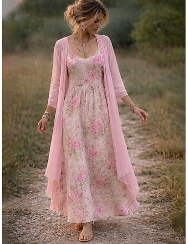 Per donna Insieme del vestito Abito a trapezio Elegante Vacanza Floreale Grafico Stratificato Stampato Abito maxi Manica Lunga Scollo a V Quotidiano Vacanza Blu Rosa Viola Estate Primavera