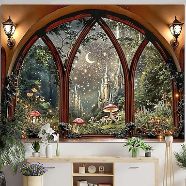 Arazzo da parete 3D con vista finestra, foresta magica, castello di funghi luminosi, notte stellata, grande poster in tessuto per soggiorno, camera da letto, dormitorio, decorazione mistica e fantasy