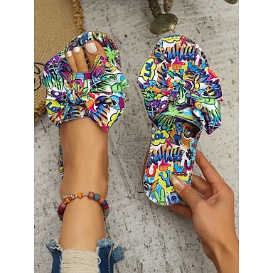 sandali piatti con fiocco colorato da donna e suola morbida, scarpe slip-on in stile boho giocoso per l'uso quotidiano, passeggiate in spiaggia, festival e attività all'aperto rilassate