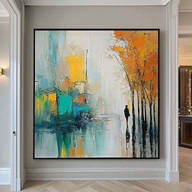 Quadro astratto fatto a mano con figure che camminano in un parco, dipinto ad olio su tela, albero, decorazione murale per la casa.