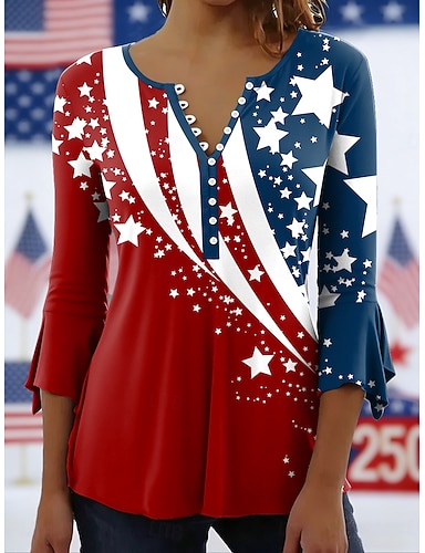 Blusa Patriottica Giorno dell'Indipendenza per Donne Grafica Bandiera Elegante Stile Maniche 3/4 Collo Giro Regolare Tops Stampa Giornale Uscita Ruffles Bottoni Blu Rosso Estate Primavera
