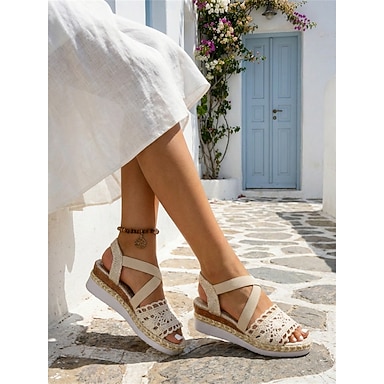 sandali con zeppa espadrillas all'uncinetto beige da donna con cinturini elastici: calzature eleganti e comode per le vacanze al mare, perfette per le gite estive e le giornate informali