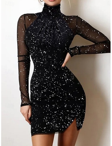 Per donna Mini Abito Tubino Elegante Festa cocktail All'aperto Feste Ospite di nozze Patchwork Tulle scintillante Vestibilità regolare Tinta unica Manica Lunga Dolcevita Nero