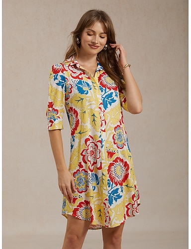 Per donna Mini Abito Abito Camicia Vestito Casual Abito Estivo Moda Quotidiano Vacanza Weekend Vestibilità regolare Floreale Manica Lunga Colletto a Camicia Blu blu acqua Rosa Verde scuro Estate