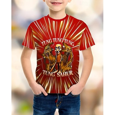 T-shirt da bambino con stampa di personaggi dei cartoni animati - Tung Tung Tung Sahur, maglietta grafica 3D, manica corta, estate, primavera, moda, basic, per bambini dai 4 ai 12 anni, girocollo,