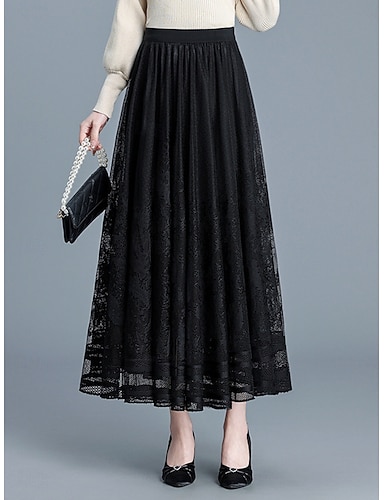 Per donna Vintage Moda Casual Maxi Vita Alta Gonne Semplice Pizzo Patchwork Inelastico Micro-elastico Quotidiano Streetwear Marrone Primavera Poliestere