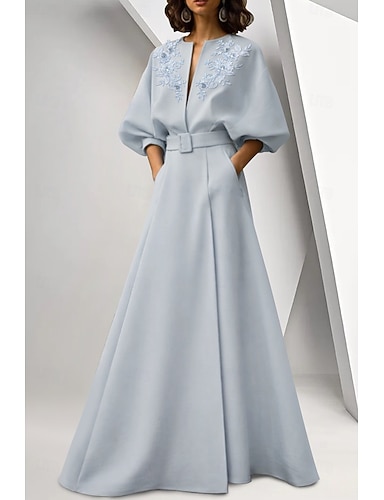 Linea ad A Lunghezza al pavimento Abito da Sera Da principessa Abito formale Elegante Manica Lunga Scollo a V Matrimonio Formale Tasca Tessuto Elasticizzato con Fiore ricamato Ricamo Applicazioni
