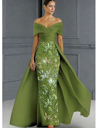 Sirena Tromba Lunghezza al pavimento Perline ricamate Abito Formale Abito da madre della sposa Abito da Sera Elegante Scintillante Stile Celebrità Manica Corta Monospalla Festa in giardino Matrimonio