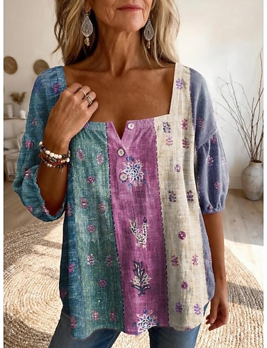 Per donna Blusa Stampato Floreale Grafico Bohemien Quotidiano Elegante Mezza Manica Collo quadrato Top Regolari Quotidiano Viola chiaro Viola Beige Estate Primavera