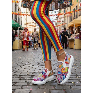 Mocassini a piattaforma bianchi con ricami colorati e motivo paisley per Mardi Gras - Calzature festose vivaci per eventi di Carnevale festival di strada feste a tema e riunioni informali