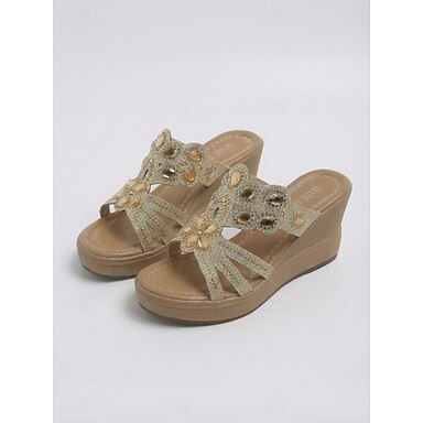 Sandali con zeppa da donna con strass – ciabatte con plateau decorate con motivi floreali scintillanti, comode scarpe estive per vacanze all'aperto, passeggiate in spiaggia e abbigliamento da resort.