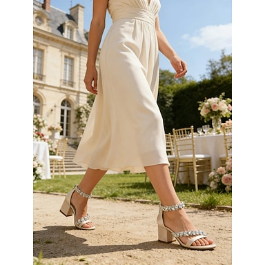 Sandali da donna con tacco a blocco argentato – sandali con tacco grosso e punta aperta, perfetti per le invitate a un matrimonio in giardino. &eventi estivi