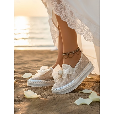 scarpe da sposa slip-on in pizzo da donna - scarpe casual da sposa da spiaggia con fiocco decorativo &comoda suola platform, perfetta per le cerimonie in riva al mare