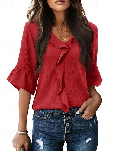 Per donna Camicia Elegant Top in raso Blusa Arricciato Volant Patchwork Semplice Elegante Vintage Quotidiano Manica Lunga Scollo a V Top Regolari Quotidiano Lavoro Ferie Nero Bianco Rosso Verde
