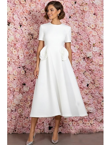 Linea ad A Lunghezza Tè Vestito da Festa Abito da Cocktail Abiti da sposa Abito da sposa Elegante Piccoli Abiti Bianchi Manica Corta Girocollo Formale Laurea con Fiori 3D Pieghe