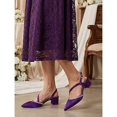 décolleté da donna in raso viola con tacco a blocco spesso, eleganti scarpe con finiture in strass per la madre della sposa ai matrimoni in città moderne