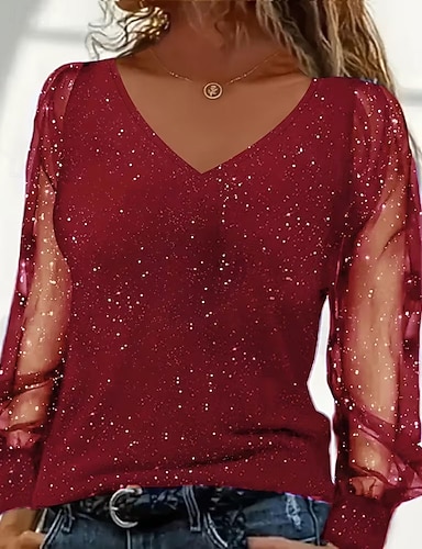 Per donna Blusa Top Eleganti Top in chiffon Top in pizzo Pieghettato Glitter Elegante Girocollo Top Regolari Ospite di nozze Uscire Azzurro Primavera Autunno
