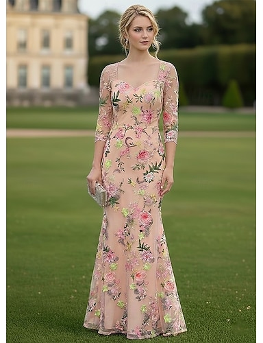 Sirena Tromba Tubino Colonna Lunghezza al pavimento Abito da Sera Elegante Floreale Manica 3/4 Scollo a Cuore Festa serale Festa in giardino Pizzo Tulle con Fiore ricamato Fiori 3D Ricamo