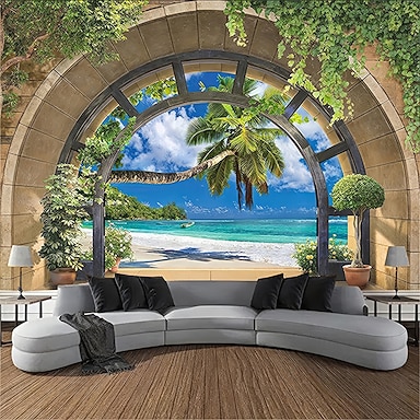 Arazzo da parete con vista sulla spiaggia in 3D, finta finestra, oceano, palme tropicali, paesaggio costiero, decorazione da parete per soggiorno, sala yoga