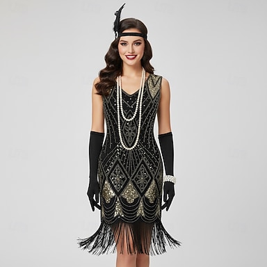 Set Anni Ruggenti Anni 1920 Lunghezza al ginocchio Abito Flapper Abiti Fascia Flapper con accessori Senza maniche Il grande Gatsby Invitato al matrimonio Paillettes Frangia con nappe Scollo a V
