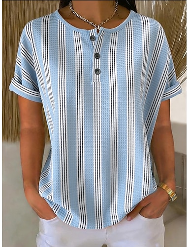 Per donna Top a maglia con texture Maglietta Blocco di colore Grafico Geometria Elegante Classico Manica Corta Girocollo Henley Top lunghi Quotidiano Sportivo Blu Bianco Estate Primavera