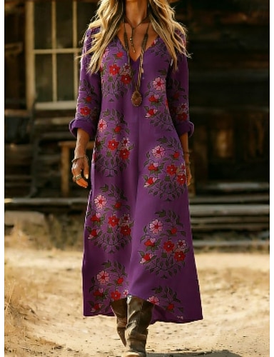 Per donna Abito lungo maxi Abito Boho Abito Vintage Vestito Casual Vintage Quotidiano All'aperto Vacanza Vestibilità regolare Floreale Manica Lunga Scollo a V Viola Primavera Autunno