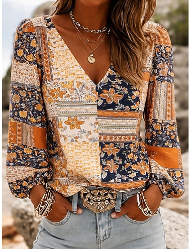 Per donna Camicia Camicia Boho Stampato Floreale Grafico Elegante Bohemien Vacanza Manica Lunga Scollo a V Top Regolari Casuale Quotidiano Ferie Blu Rosa Arancione Verde Estate Primavera
