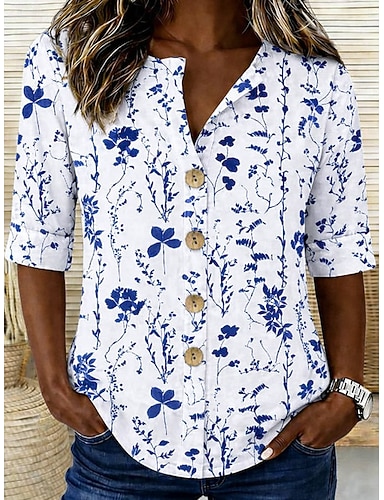 Per donna Camicia Stampato Floreale Grafico Elegante Vintage Tropicale Mezza Manica Scollo a V Top Regolari Quotidiano Ferie Abbigliamento mare Bianco e blu Estate Primavera