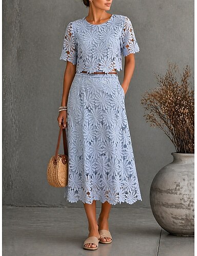 Per donna Set di gonne Manica Corta Girocollo Floreale Grafico Semplice Foro Elegante Moda Casuale Quotidiano All'aperto Blu Estate Vestibilità regolare