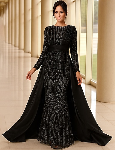 Abiti Formali Floor Length Sheath Column Abito da Sera Abito da Sera Elegante Vintage Maniche Lunghe Collo a Giro Festa di Halloween con Perline