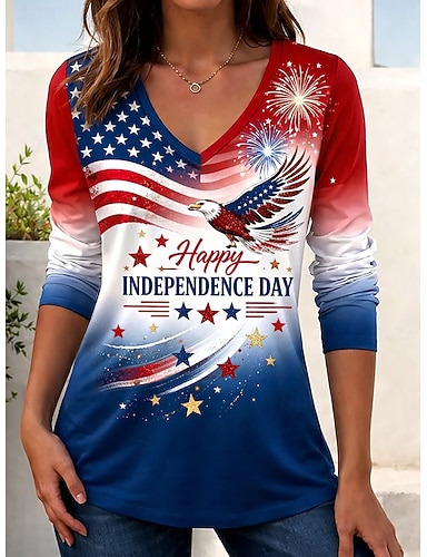 Giorno dell'Indipendenza Americana Per donna Maglietta Blocco di colore Stampato Grafico Bandiera Americana Vintage Elegante Classico Manica Lunga Scollo a V Top Regolari Quotidiano Weekend Bianco